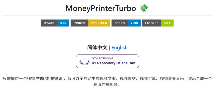 MoneyPrinterTurbo GitHub 地址:https://github.com/harry0703/MoneyPrinterTurbo