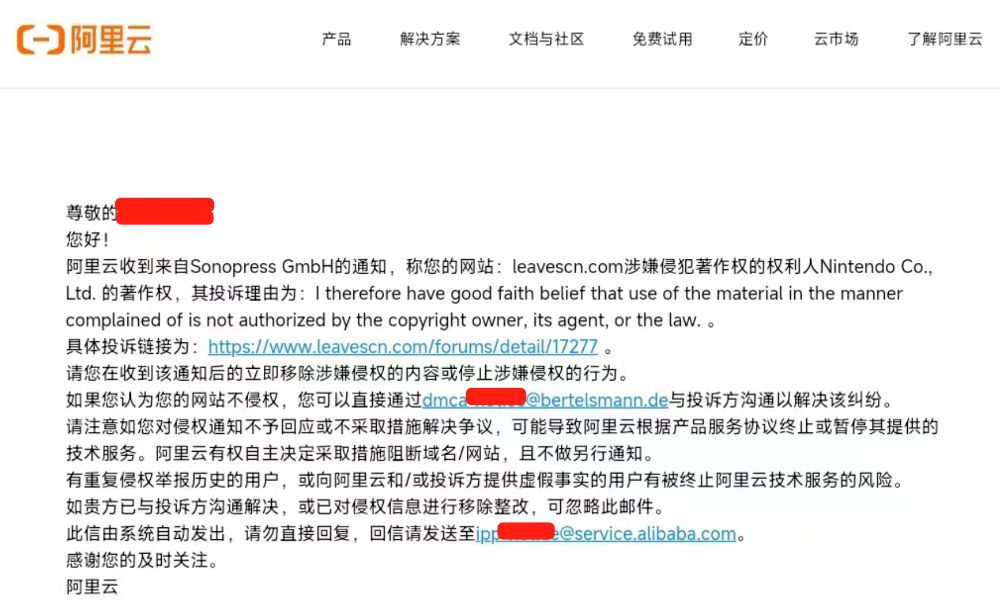 收到阿里云知识产权侵权举报通知,通知内容显示https://www.leavescn.com/Forums/Detail/17277这个页面有侵权内容。如果不处理的话间隔一段时间又会收到邮件提醒。于是自查内容,文章是拼接原创,图片来自网络,附有盗版游戏下载地址。所以屏蔽了下载链接。后续不再收到侵权举报通知。