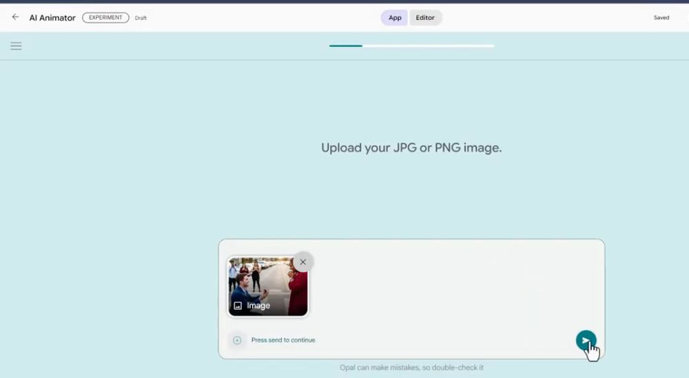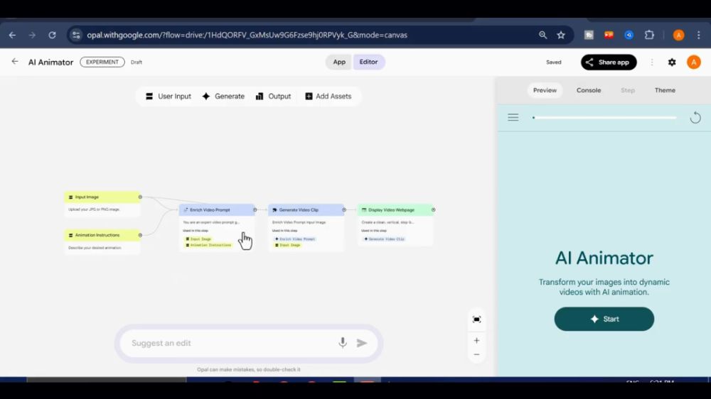 登录opal后,点“开始”,粘贴提示词,进入编辑器,这里有上传图片、动画指令等选项。