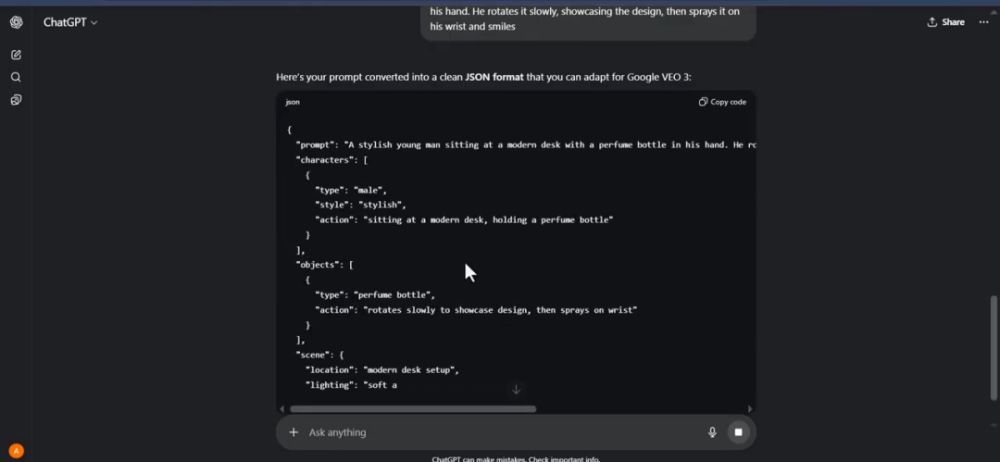 制作广告视频,用JSON提示词。把普通提示词给Chat GPT,让它转成JSON格式,复制到opal。也能在GPTs里搜JSON,用现成工具。我推荐第一种方法。