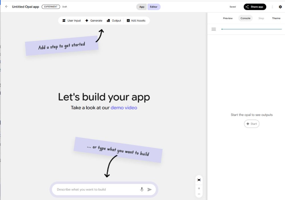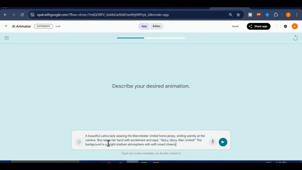 我的应用已经设置好了,能开始给提示词生成视频。有两个选择,一是上传图片,让opal给图片做动画。二是直接给提示词,让opal从头生成视频。
