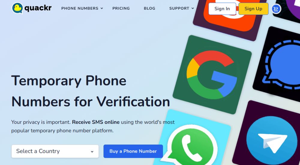 Quackr(https://quackr.io/)提供来自24个国家的虚拟手机号码,用户可以选择所需国家的号码进行短信接收。