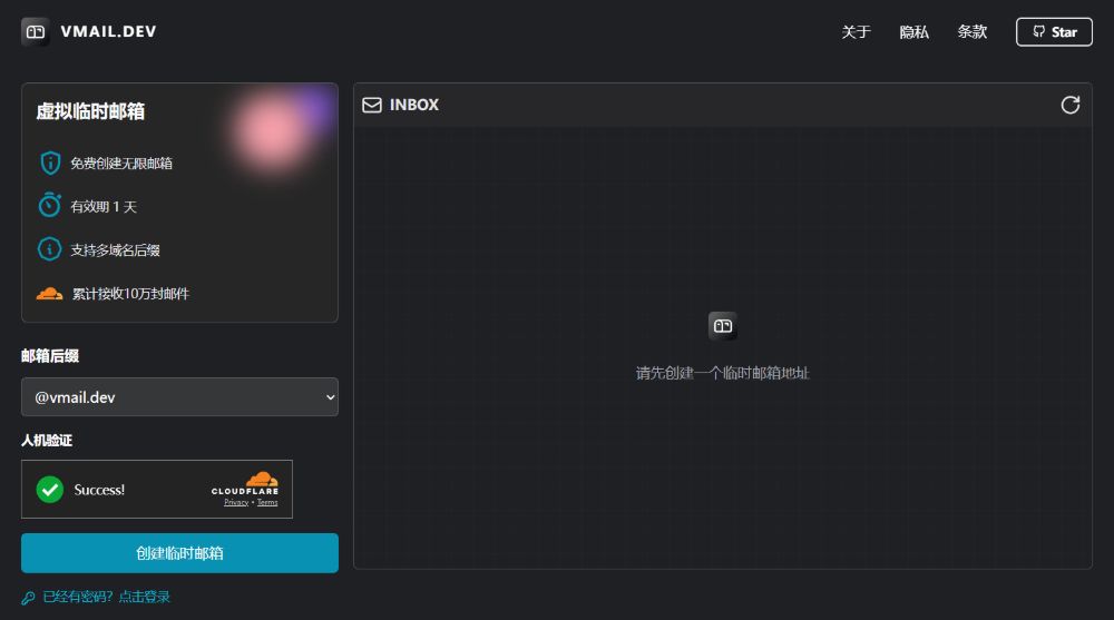 Vmail.dev 是一个虚拟临时邮件服务平台,用户无需提供任何个人信息即可立即获取一个有效期约 24 小时 的临时邮箱地址。该服务完全运行在 Cloudflare 网络之上,确保访问快速、安全且稳定。