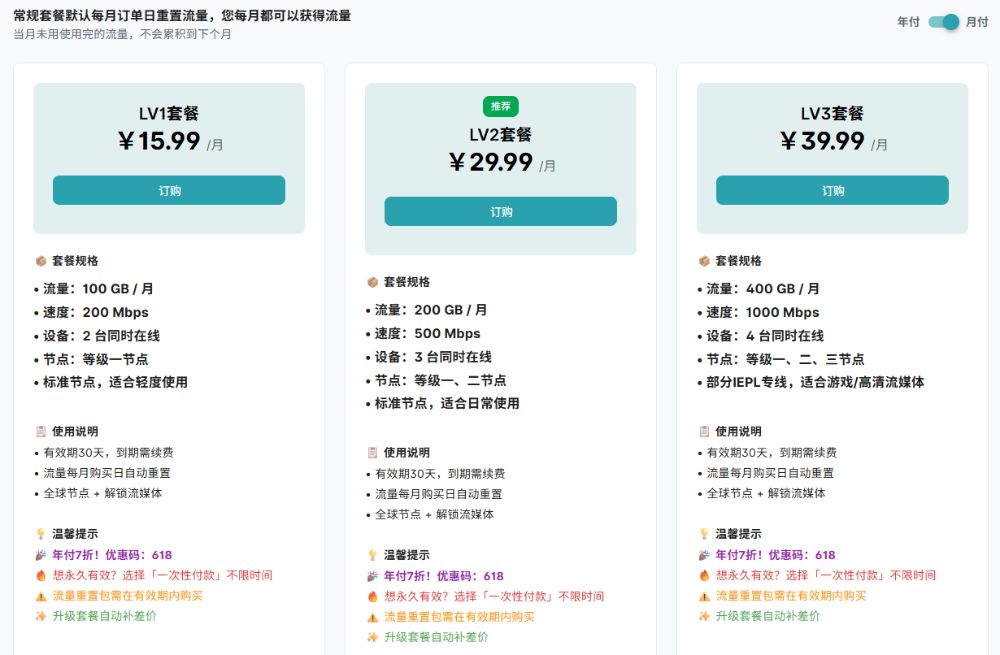 建议:新手用户在选择套餐时可从中档(如 LV2/LV3)开始体验,后续根据实际流量与使用需求再升级。同时解锁流媒体时可测试不同节点以获得最佳体验效果。