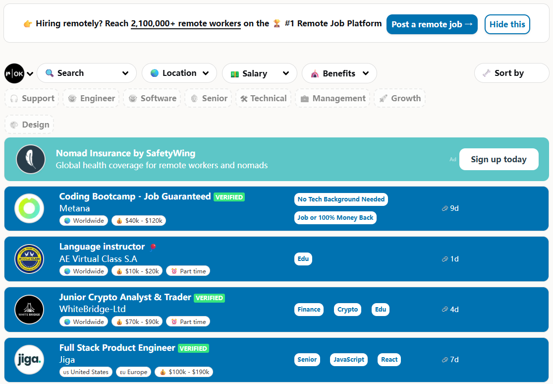 RemoteOK是远程工作领域非常热门的网站,主要发布远程兼职和合约型项目。