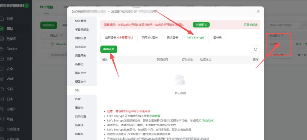 在宝塔面板左侧导航栏中选择 “网站” → “添加站点”,可以选择几种方式。我们最简单的是选择一键部署的方式。