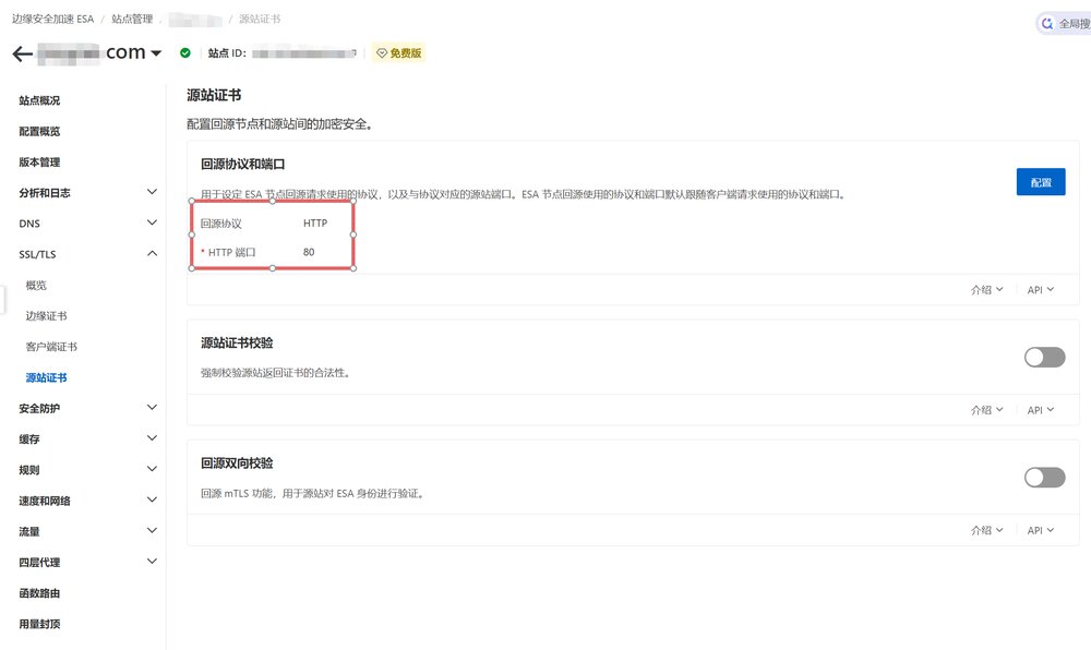 如果你已经在源站启用了 HTTPS 并配置了证书,请确保 ESA 的回源协议设置为 HTTPS,并且源站 SSL 配置合法无误。