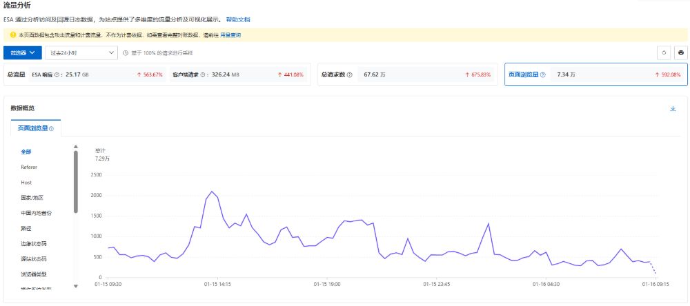 可以在流量分析里查看日志数据,可以看到总流量、客户端请求、总请求数、页面浏览量、国家地区、请求头、请求URL等很多信息,如下图所示,是我的一个网站过去24小时的数据: