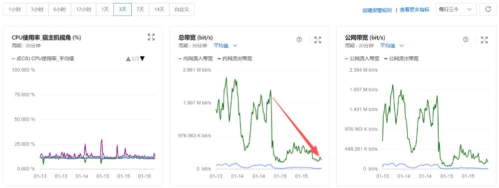 使用 ESA 加速服务后,查看了服务器的监控,可以看到总带宽明显下降了。对于使用3MB固定带宽的用户来说,大大节约了带宽,提升了网站的性能。