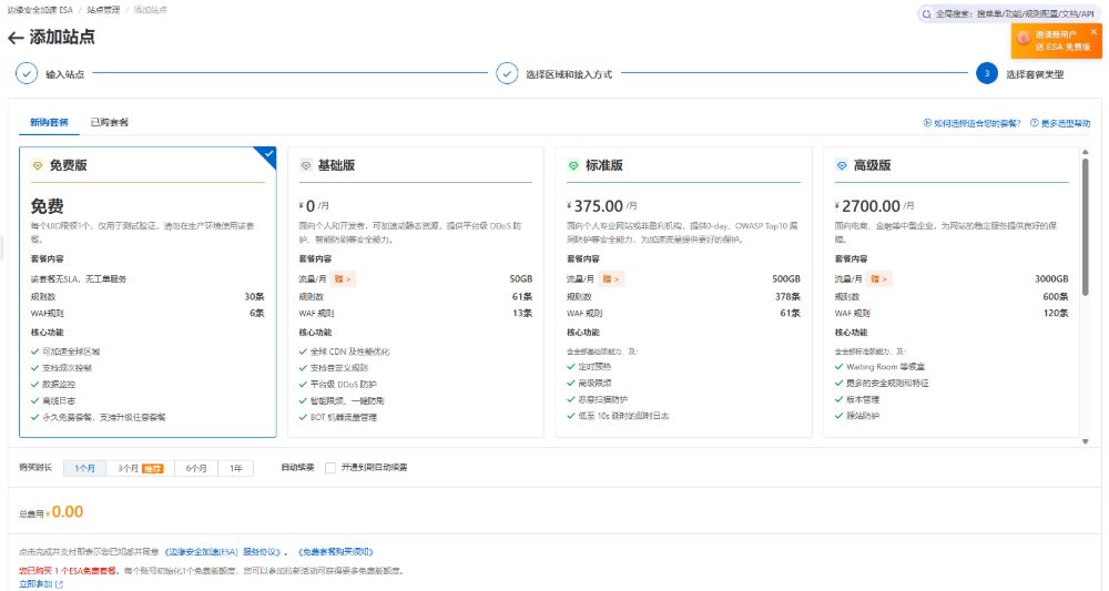 实际使用过程中,开启免费版的流程较为简便。用户只需在 ESA 控制台中添加站点,选择免费版套餐接入即可快速完成部署。对于国内访问加速,一些渠道甚至可以通过官方活动直接解锁内地网络加速能力。