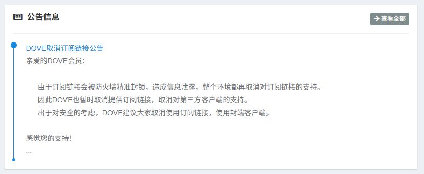 近日,DOVE官方发布公告宣布将 取消对订阅链接的支持,并停止第三方客户端接入服务。公告指出,订阅链接在当前网络环境下存在被防火墙精准封锁的风险,同时可能导致用户信息泄露,因此出于安全保护的考虑,DOVE决定暂时下线这一功能。