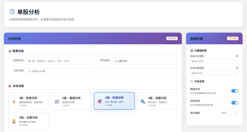 启动成功后,在浏览器访问 http://localhost:8501 即可进入操作界面。系统提供直观的分析配置区域,用户只需输入股票代码(如AAPL、000001或0700.HK)、选择AI模型并点击开始分析,即可实时查看分析进度与结果。